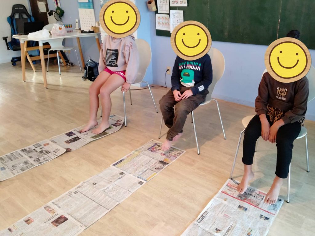 長く繋げた新聞紙を足の裏を使ってはより早く引き寄せるというゲームです。見た目通り簡単なゲームですが、いざ勝負となると子ども達のやる気スイッチが入り、子ども達の意地と意地がむき出しになる、白熱したゲームになりました。