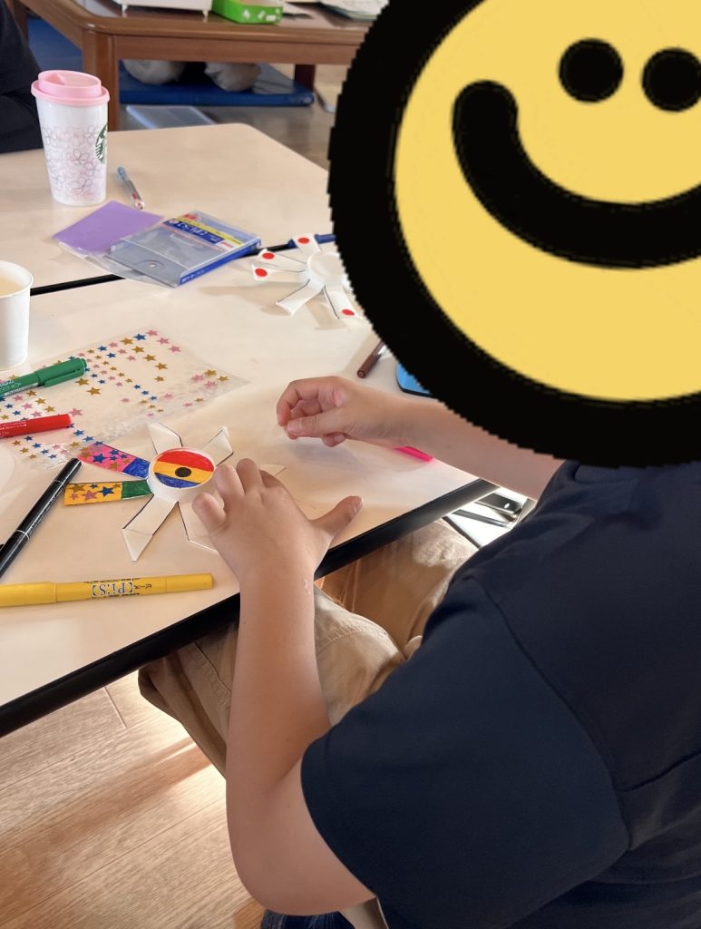 紙コップに予めカットするガイドラインを引いて、そのラインに沿ってハサミで丁寧にカットしています。カットして開いた紙コップにペンやシールでデザインしていきます。みんな色々なデザインをしていて、コマの形をアレンジしているお友達もいました。