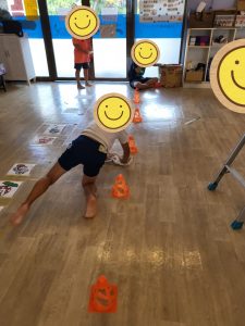 本日は基礎体力向上や健康的な運動習慣を育み、体を動かす楽しみをお友達と共有することを目的にサーキットトレーニングに取り組んでいます。ビジョントレーニング時の反応が良かったので、引き続き好きなゲームやアニメのキャラクターを選び、そのキャラに扮する形でなりきってもらい、楽しく運動できるようにと期待して企画しました。